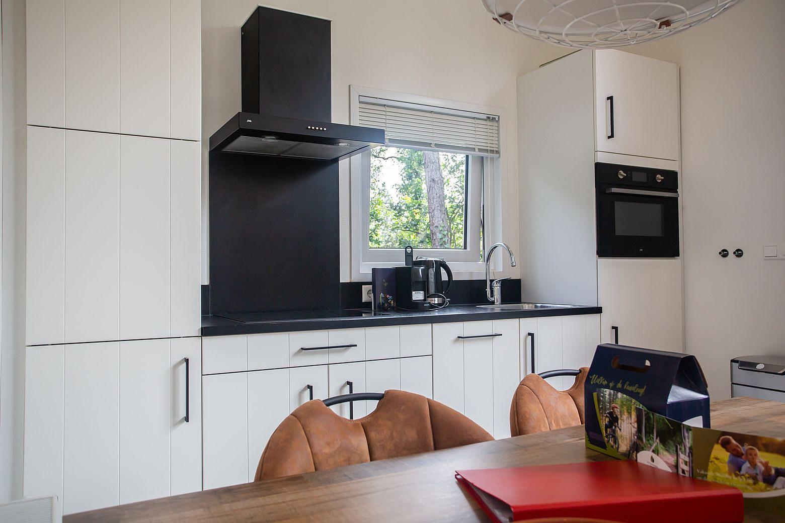 De luxe keuken vormt het hart van de woning en is uitgevoerd met hoogwaardige materialen en inbouwapparatuur. Denk hierbij aan een gaskookplaat, combimagnetron, koelkast met vriesvak, vaatwasser en een stijlvolle afzuigschouw. Het ruime werkblad en de praktische indeling maken dit een zeer functionele én esthetische keuken.