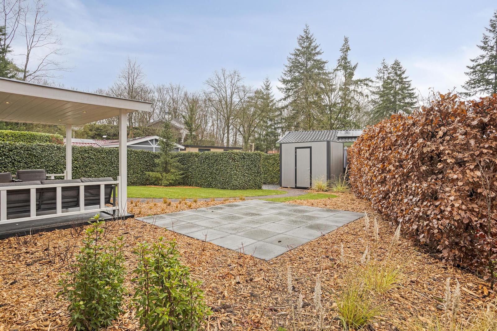 Rondom de woning ligt een recent opnieuw aangelegde tuin, waarbij het tuinonderhoud volledig is vernieuwd. De tuin biedt meerdere zitplekken, veel privacy en beschikt over een nieuwe, vrijstaande schuur voor fietsen en opslag.